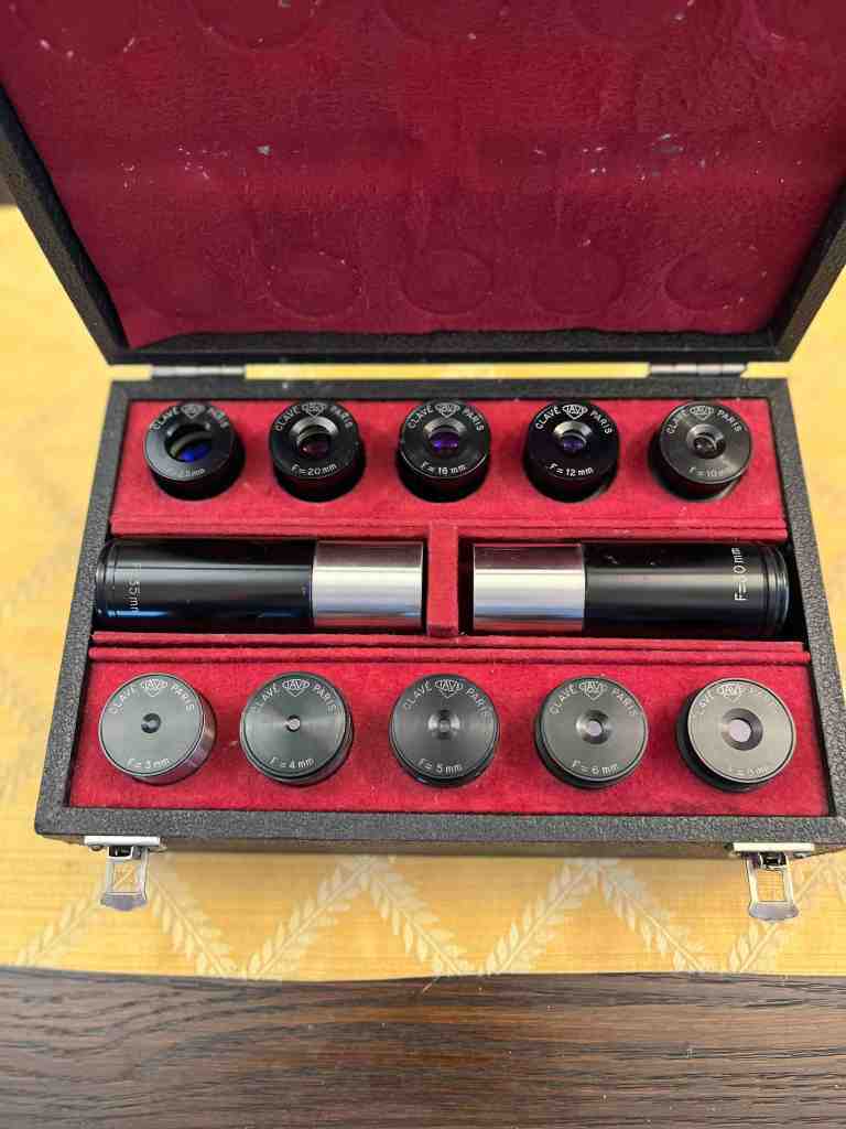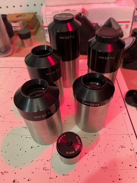 Often called the “French Zeiss”, Clavé Paris eyepieces are for the most part parfocal asymmetric Plossls (whatever that means-lol!), ranging from 3mm – 75mm. They hold an almost mythological reputation as being the some of the finest eyepieces made for amateurs as well as professional astronomers. I just know they are spectacular and I have become almost addicted to collectiing and using them. Very simple designs for the optimal purist, they excel at planetary and deep sky viewing. The secret to their fantastic contrasty views comes from the exclusive glass used in the early generations, excellent coatings and professional quality construction. They give a “warm” appearance to planets which helps with contrasting features on Jupiter. They became available in the 1950’s, and went through various “generations” of production as the hardware, glass, coatings and ultimately the ownership of the company evolved.