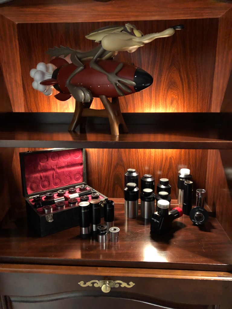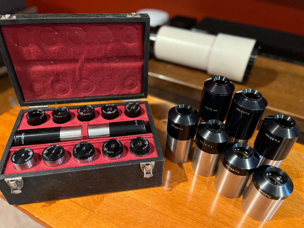 Above is an entire set of 3mm – 35mm. An additional set of professional grade larger focal eyepieces was created for use at and in celebration of the “Pic Du MIdi” observatory. I have an almost complete set of the “Pic DU Midi Series”, featuring a 2″ barrels from 30mm -65mm. I am finally fpund a 75mm!